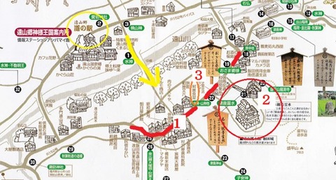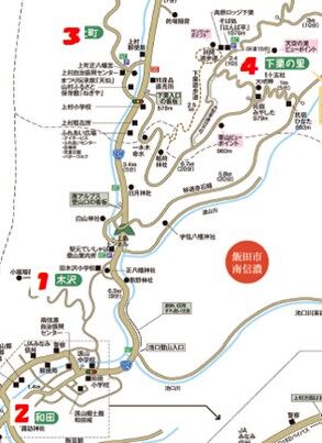 黄色矢印のように戻ってきて、まず秋葉街道(国道152号線)に沿って発達した和田宿の赤い太線の部分を往復し、続いて2番目に遠山郷土館となっている和田城を見学、その後赤字3の場所で営業している紺屋食堂で昼食となった。 南信濃村の…