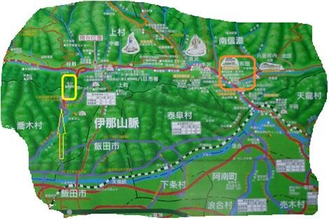 ホテルルートイン駒ヶ根インターのフロントから、赤い線の最短路は峠越えの悪路で時間が掛かるということを聞いていて、少し遠回りになるが彼に薦められた黄矢印の三遠南信自動車道(=国道474号)から遠山郷へ向かった。