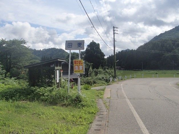 この田麦と書かれている立て看板を入ると、そこは田麦集落である。