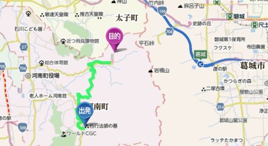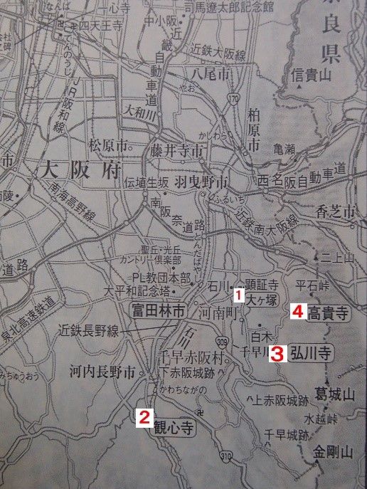 これから、司馬さんの「街道をゆく 河内みち」の世界を散策するが、まず赤字1の「大ヶ塚」、次に赤字2の「観心寺」、更に赤字3の「広川寺」、最後に赤字4の「高貴寺」に行く。