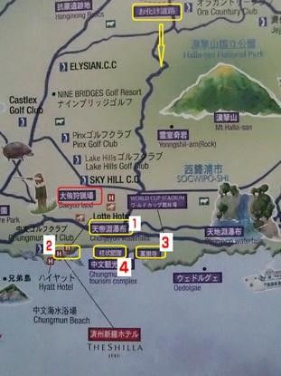 これから神秘の道路とも呼ばれている、トケビ道路を見学、その後済州島を北から南に横断し、島の南部の中文リゾートを中心に見学する。(赤四角の範囲が見学地となる。)