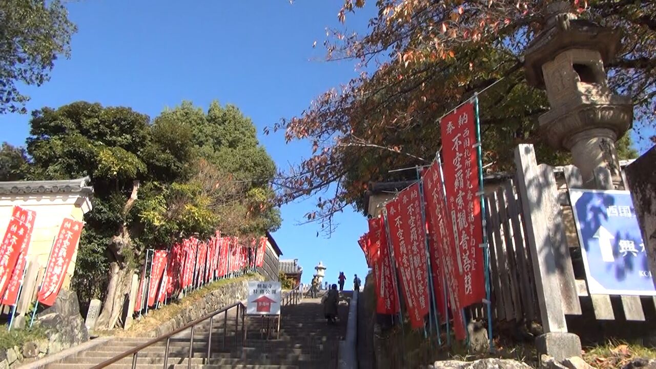 南円堂の中にある国宝の不空羂索観音が現在特別公開中ということで、階段道の両脇にびっしり「不空羂索観音菩薩」と書かれた幟旗が並んでいる。