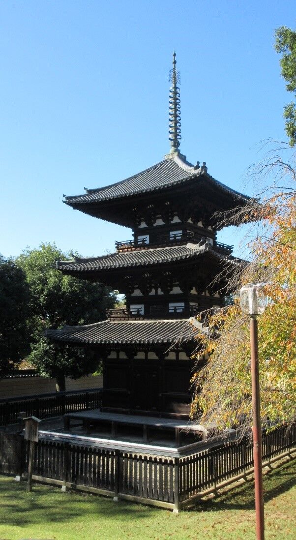 樹々を抜けるとその奥から、まことに美しい三重塔が見えてきた。
