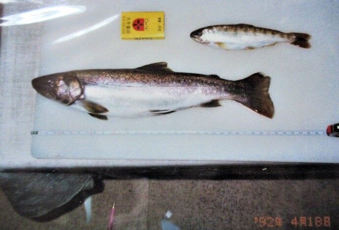 師匠の弟子の釣り師も同じ淵で、たぶん養魚場から逃げ出たのだろう大きな虹鱒を、平成4年(1992年)5月17日に釣り上げた。